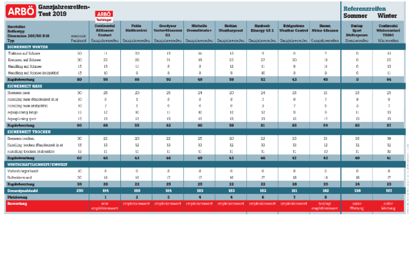 Als klarer Testsieger wurde der Continental AllSeason Contact mit „sehr empfehlenswert“ ausgezeichnet, weitere 6 Produkte erhielten ein „empfehlenswert“.