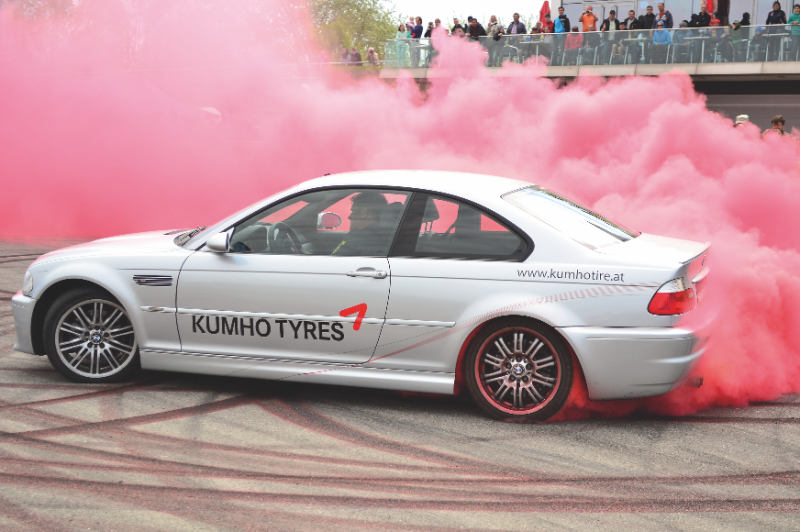"Unsere Innovationsbegeisterung stellen wir bei Kumho nicht zuletzt mit Konzeptreifen und Sonderanfertigungen unter Beweis", so Sonja Eckhart, Marketing Manager in derÖsterreich-Niederlassung von Kumho. "Wir haben unter anderem rote, blaue und gelbe Farbrauchreifen für Driftwettbewerbe entwickelt."