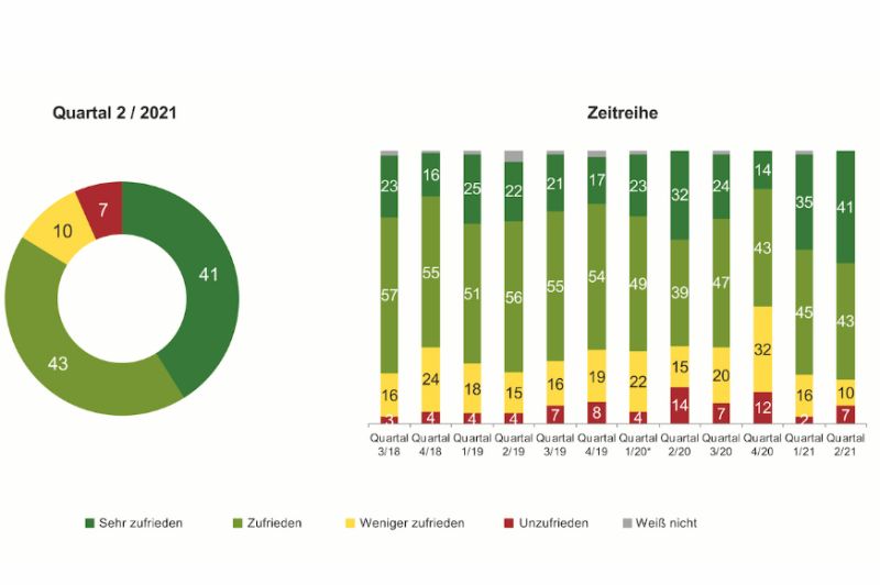 Die Zufriedenheit mit den Gebrauchtwagenverkäufen ist im 2. Quartal ebenfalls auf einen Rekordwert gestiegen. Insgesamt geben 84 Prozent der befragten Markenhändler an, mit den Abschlüssen sehr zufrieden (41 Prozent) bzw. zufrieden (43 Prozent) zu sein. Das ist der beste Wert seit dem Start des Händler-Trend-Barometers Österreich im dritten Quartal 2018. Die hohe Nachfrage sowie den Mangel an Gebrauchtwagen zeigt die Entwicklung der Standtage, die von niedrigen Werten nach Q4/20 und Q1/21 erneut deutlich gesunken ist und mit 58 Tagen den mit Abstand niedrigsten Wert seit Beginn der Befragung darstellt.