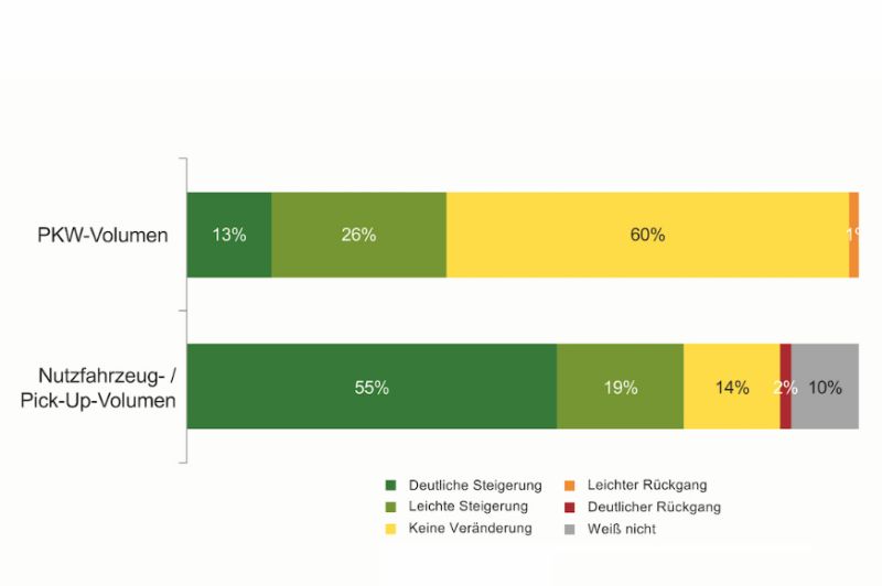 Die Engpässe in der Neuwagen-Lieferfähigkeit haben auch Auswirkungen auf die - grundsätzlich guten -Betriebsergebnisse der beim Händler-Trend-Barometer befragten Markenbetriebe. 41 Prozent (statt tatsächlich 21 Prozent) der befragten Betriebe hätten eine deutliche Steigerung realisieren können. 14 Prozent der Händler mussten einen leichten Rückgang hinnehmen, ohne Lieferprobleme wären es nur 3 Prozent gewesen. Tatsächlich haben 5 Prozent der interviewten Händler einen deutlichen Rückgang hinnehmen müssen, das wäre bei voller Lieferfähigkeit bei keinem der Unternehmer eingetreten.