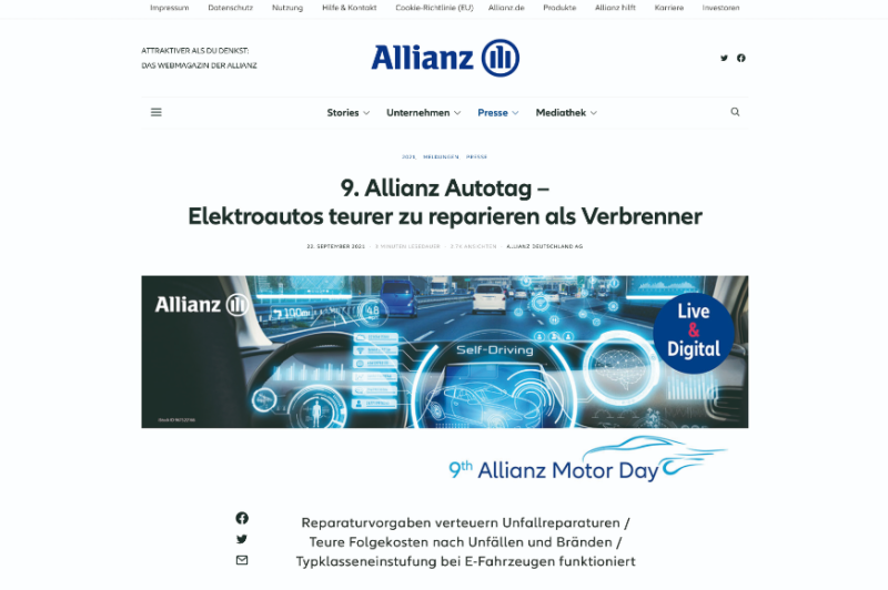 Das AZT hat Schäden von Fahrzeugen mit elektrischem Ladeanschluss und nennenswerter elektrischer Reichweite im Zeitraum 2018 bis 2020 unter die Lupe genommen. Auf dem 9. Allianz Autotag wurden die Ergebnisse präsentiert.
