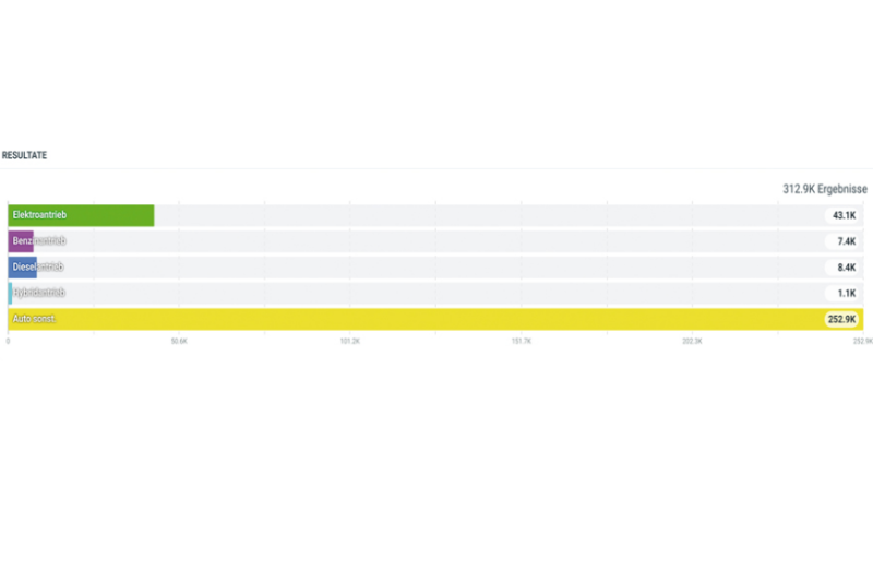 Das beliebteste Thema (43.100 Ergebnisse): E-Modelle. An zweiter Stelle folgen Diesel (mit 8.400 Ergebnissen), dann kommen Benziner (mit 7.400 Clippings); Hybridantriebe bilden mit 1.100 Ergebnissen das Schlusslicht.