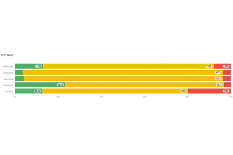 Die Berichterstattung über Hybridantrieb wird mit 23,2 Prozent positiven und 3,1 Prozent negativen Clippings mit einer sehr positiven Tonalität publiziert. Gefolgt vom Elektroantrieb, der mit 13 Prozent positiver und 7,9 Prozent negativer Einordnung kontrovers diskutiert wird. Benzin- und Dieselantriebe werden medial mit je 4 Prozent positiven und 3 Prozent negativen Berichten eher wertfrei betrachtet.