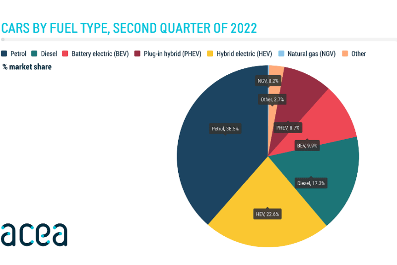 Im 2. Quartal 2022 hat sich der Anteil der Neuzulassungen von rein batterieelektrisch betriebenen Pkw (BEV) in der Europäischen Union auf 9,9% erhöht, berichtet der Branchenverband ACEA.
