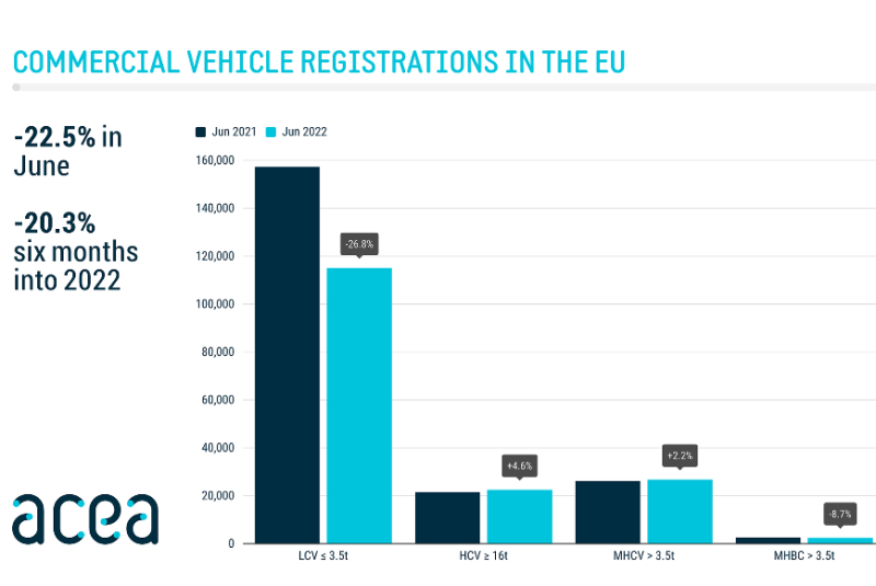 Mittlere und schwere Nutzfahrzeuge (MHCV) über 3,5 Tonnen konnten hingegen im Juni 2022 um +2,2% auf 26.736 Stück zulegen. Schwere Nutzfahrzeuge (HCV) über 16 Tonnen wiesen eine Steigerung um +4,6% auf 22.482 Einheiten auf.
