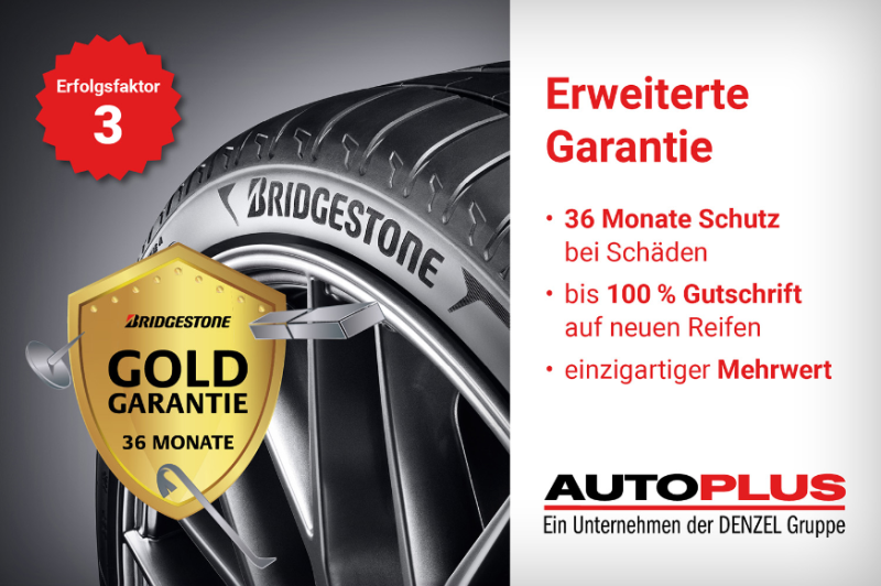 Ein zusätzlicher Erfolgsfaktor ist die erweiterte „3 Jahre Gold Garantie“. Diese ermöglicht es dem Händler-Partner, dem Kunden im Schadenfall bis zu 100 % Gutschrift auf den Neu-Reifen von Bridgestone zu bieten. Diese wird komplett von AUTO PLUS übernommen und stellt sowohl ein einmaliges Verkaufsargument als auch ein sinnvolles Instrument zur Kundenbindung dar – ohne jeglichen Aufwand für den Händler.