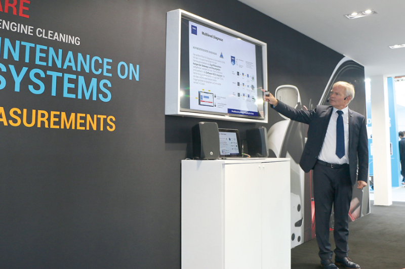 Texa gewährte in Frankfurt mehrere Blicke in die Zukunft, unter anderem mit dem Vision Check Concept in Kooperation mit der VSG. Dabei wird dem Anwender das Kalibrieren eines Fahrzeugs denkbar einfach gemacht: Nachdem das Gerät genau nach digitaler Anleitung in Position geschoben wurde, richtet sich der Bildschirm selbstständig aus. „Das bedeutet natürlich eine enorme Zeitersparnis“, sagt Andreas Inzinger, Area Manager Österreich/ Deutschland-Bayern bei Texa Deutschland GmbH. Geplant sei das Produkt für kommendes Jahr.