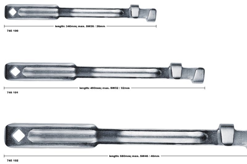 Die universelle Verlängerung ist in 3 unterschiedlichen Varianten erhältlich. Das kleinste Modell (Standard, Art.-Nr. 745 100) ist 340 Millimeter lang und passt für Schlüsselweiten bis 26 Millimeter. Aufgrund der kompakten Maße eignet sich diese Uni-Verlängerung auch für den Einsatz an schwer zugänglichen Stellen. Die mittlere Variante (Medium, Art.-Nr. 745 101) ist 450 Millimeter lang und für Schlüsselweiten bis 32 Millimeter geeignet. Für größere Schrauben ist die Nutzung des Large-Modells (Art.-Nr. 745 102) mit einer Länge von 580 Millimetern vorgesehen. Mit dieser universellen Verlängerung lassen sich Schraubenschlüssel mit einer Weite bis zu 46 Millimetern sicher und effektiv verlängern.