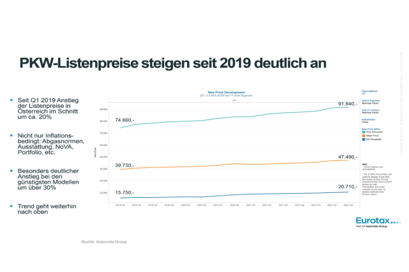 Die Pkw-Listenpreise seien in Österreich von Anfang 2019 bis Q3 2022 im Schnitt um knapp 20 Prozent gestiegen, so Madas: „Der Trend geht weiter nach oben.“ Besonders bei günstigeren Fahrzeugen sei die Preissteigerung mit über 30 Prozent sehr deutlich. Dieser Anstieg sei nicht nur inflationsgetrieben, sondern auch durch bessere Ausstattungen, alternative Antriebe oder geänderte Besteuerung zu erklären. „Wir beobachten deutliche Verschiebungen nach oben bei allen Segmenten.“