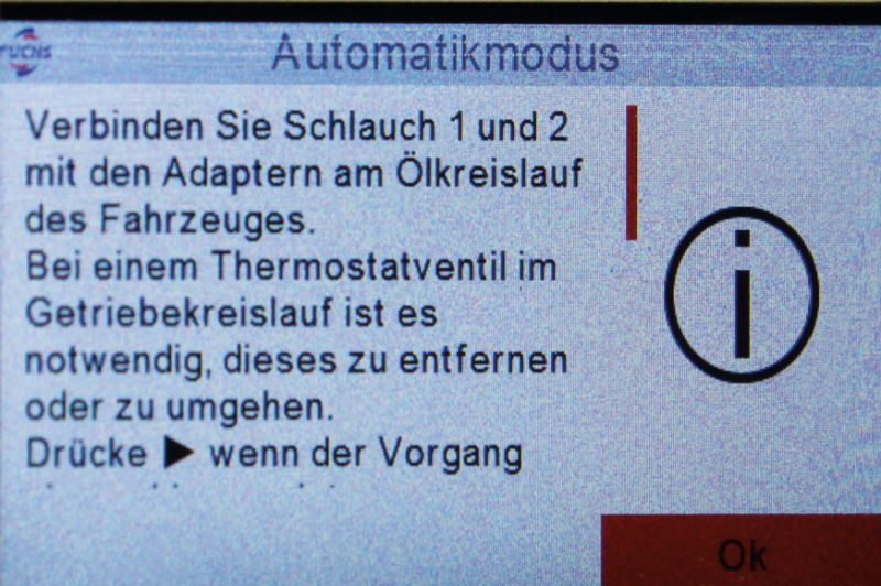 Die Bedienung erfolgt über das Bedienteil mit Bildschirm, der Ablauf wird vom Gerät vorgegeben: Nach der Auswahl des Fahrzeuges über den Suchbaum werden das richtige Öl bzw. Ölmenge und die richtige Montage der Schläuche – mit den korrekten Adaptern – angezeigt. Nach erfolgtem Anschluss läuft die Absaugung des Altöls und die Befüllung mit Frischöl samt Spülung des Getriebes. Dabei ist ein Zusatzvolumen für die entsprechende Spülung vorgesehen, zeigt das Schauglas am Gerät aber noch Trübungen, kann dann mit zusätzlichem Frischöl noch weitergespült werden.