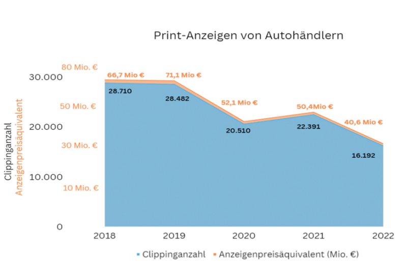 Zwischen Jänner 2018 (also schon zwei Jahre vor Beginn der Pandemie) und November 2022 gab es beim potenziellen Werbewert der Autohändler einen Rückgang um fast 40 Prozent, nämlich von 66,7 Millionen Euro auf 40,6 Millionen Euro. Im Vergleich dazu sind auch bei den Autoherstellern die Printwerbeausgaben von 55,5 Millionen Euro auf 22,8 Millionen Euro eingebrochen. Dies ist ein Rückgang von 58,9 Prozent.