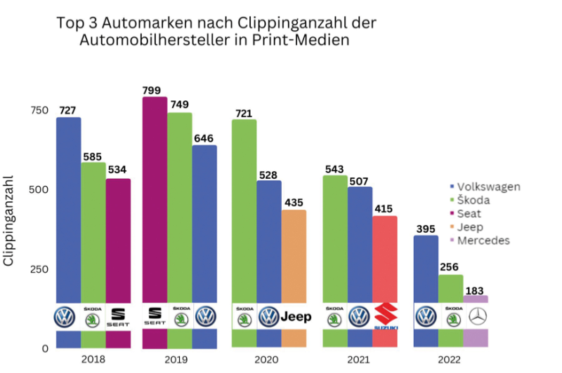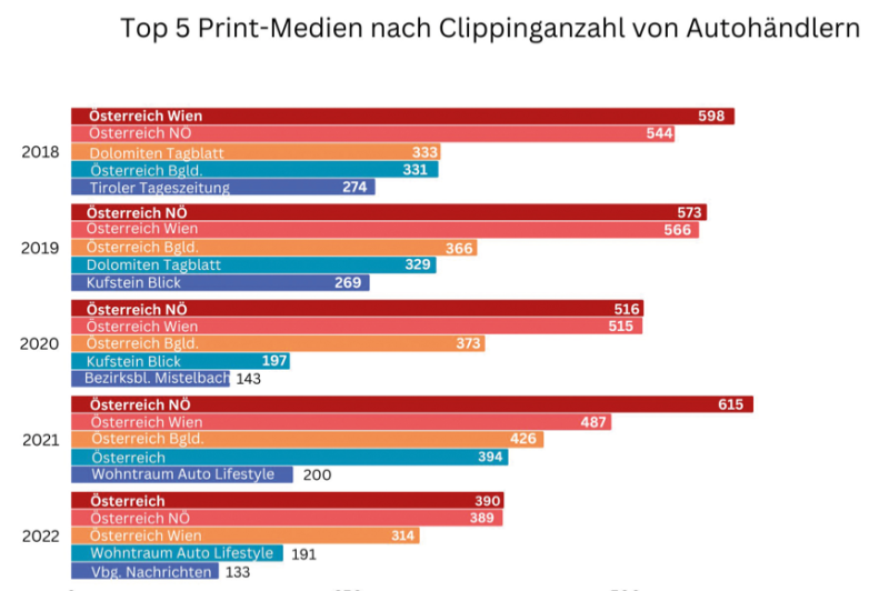 Automobilhersteller inserieren am öftesten in der „Kronen Zeitung“. Seit 2020 ist das Monatsmagazin „Autorevue“ unter den Top 5 Print-Medien. Auch regionale Zeitungen mit geringerer Reichweite, wie zum Beispiel die „Salzburger Nachrichten“ und die „Vorarlberger Nachrichten“, schaffen es immer wieder unter die Top 5 Print-Medien mit der höchsten Clippinganzahl.