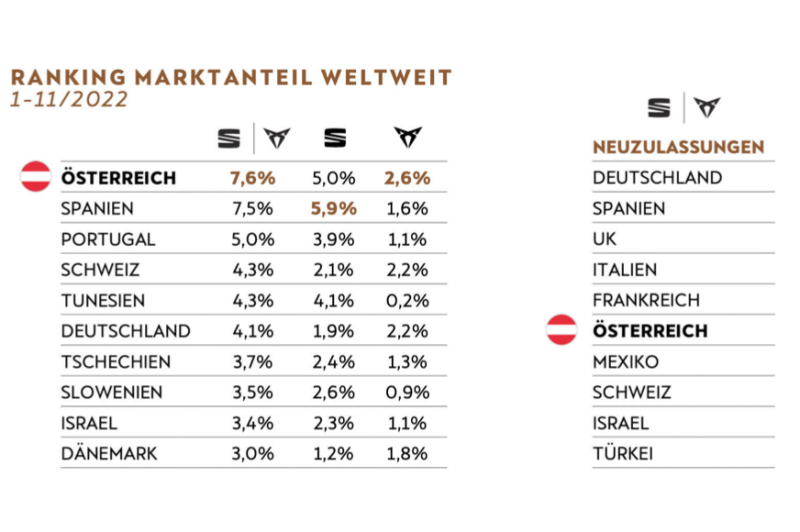 Für Mag. Wolfgang Wurm, den langjährigen Chef des Importeurs, ist es ein Verdienst der Händler, die – trotz der massiven Schwierigkeiten bei einigen Modellen und des Wegfalls des Alhambra – den Marktanteil von 7,6 Prozent ermöglicht haben. „Denn die Produkte sind ja in jedem Land dieselben. Aber unsere Händler sind extrem engagiert, das ist nun der Lohn dafür.“ In Spanien, dem Heimmarkt von Seat und Cupra, kamen die beiden Marken nach den 11 Monaten 2022 auf 7,5 Prozent, an dritter Stelle folgt Portugal (5,0 Prozent).Der Österreich-Importeur hofft nun, dass die Lieferverzögerungen bei einigen wichtigen Modellen (vor allem beim Leon) im Laufe des Jahres 2023 behoben werden können. Irgendwann könnte, so der insgeheime Wunsch, auch die „Fast Lane“ wieder ins Leben gerufen werden, die eine Lieferung eines Wunschfahrzeugs binnen 3 Wochen ermöglicht und derzeit nicht angeboten wird.