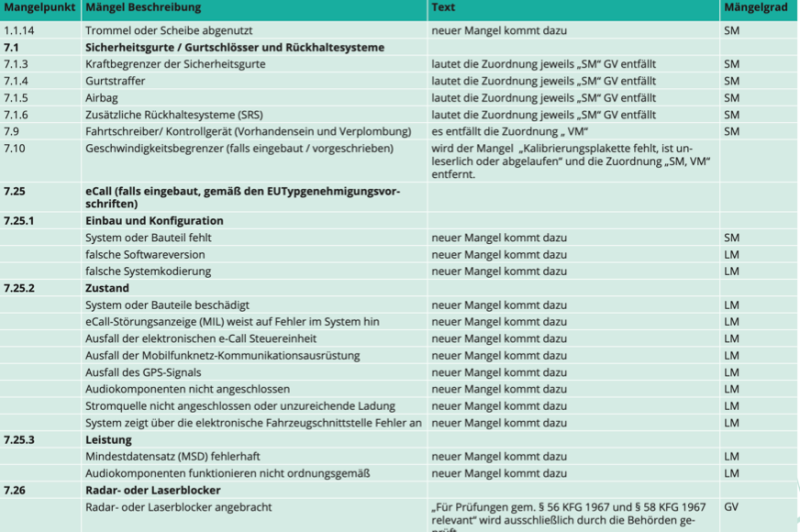 Auch in der ZBD (Zentrale Begutachtungsplakettendatenbank) sowie in der Begutachtungssoftware Vecos wurden alle erforderlichen Änderungen für die 10. Novelle der PBStv durchgeführt. Die Änderungen bei den Mängeln sind hier im Foto abgebildet.