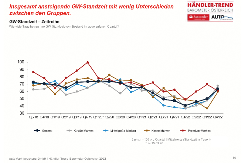 Die Zufriedenheit beim GW-Verkauf hat im 4. Quartal 2022 wieder zugenommen. Während im 3. Quartal noch 22 Prozent der beim Händler-Trend Barometer Österreich befragten Händler angaben, sehr zufrieden bzw. 32 Prozent zufrieden zu sein, lag deren Anteil im letzten Quartal bei 23 Prozent (sehr zufrieden) bzw. 39 Prozent (zufrieden). Bei großen Marken zeigten sich 48 Prozent weniger zufrieden oder unzufrieden, 52 Prozent gaben an, sehr zufrieden oder zufrieden zu sein. 37 Prozent der Befragten im Segment der kleinen Marken zeigten sich weniger zufrieden oder unzufrieden, 63 Prozent waren hingegen (sehr) zufrieden. Bei mittelgroßen Marken gaben 33 Prozent an, weniger zufrieden oder unzufrieden zu sein, 67 Prozent zeigten sich (sehr) zufrieden. Die größte Zufriedenheit herrschte im abgelaufenen Quartal bei Premium-Marken: 77 Prozent der Befragten waren (sehr) zufrieden, lediglich 23 Prozent zeigten sich weniger zufrieden oder unzufrieden. Im Vergleich zum 3. Quartal 2022 ist die GW-Standzeit laut Händler-Trend Barometer Österreich im letzten Quartal des vergangenen Jahres wieder deutlich angestiegen. Während die GW-Standzeit im 3. Quartal noch durchschnittlich 50 Tage betrug, stieg sie im letzten Quartal auf 63 Tage an. Die höchste Standzeit verzeichneten mittelgroße Marken mit 68 Tagen, gefolgt von großen Marken (63 Tage) und Premiummarken (61 Tage). Den geringsten Wert verzeichneten kleine Marken mit durchschnittlich 60 Tagen. Die niedrigste GW-Standzeit seit Beginn des Händler-Trend Barometers wurde im 1. Quartal 2022 mit durchschnittlich 41 Tagen verzeichnet.