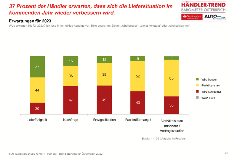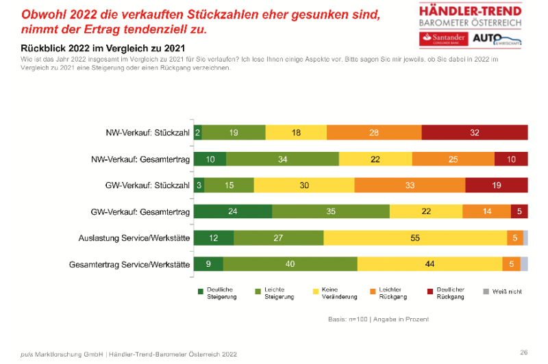 Trotz sinkender Verkaufszahlen hat der Ertrag 2022 tendenziell zugenommen. Das ergibt die 18. Welle des von puls Marktforschung in Kooperation mit Santander Consumer Bank sowie AUTO & Wirtschaft durchgeführten Händler-Trend Barometers Österreich. Im variablen Teil der Umfrage wurden die Händler um einen Vergleich von 2022 zu 2021 gebeten. Bei 60 Prozent der befragten Markenhändler sind die NW-Verkäufe zurückgegangen, bei 21 Prozent gestiegen. Die Gesamterträge aus NW--Verkäufen sind hingegen bei 44 Prozent der Betriebe gestiegen, bei 35 Prozent gesunken. Ein noch deutlicheres Bild zeigt sich bei GW-Verkäufen, wo 52 Prozent -einen Rückgang, 18 Prozent eine Steigerung angeben. Der Gesamtertrag aus dem Bereich GW-Verkauf ist allerdings bei 59 Prozent gestiegen, bei 19 Prozent der Händler gesunken. In der Werkstätte ist die Auslastung bei 39 Prozent der befragten Kfz-Betriebe gestiegen, bei 55 Prozent ist sie gleich geblieben. Der Gesamtertrag im Bereich Service/Werkstatt ist bei 49 Prozent gewachsen, bei 44 Prozent ist er gleich -geblieben, bei 5 Prozent leicht gesunken.