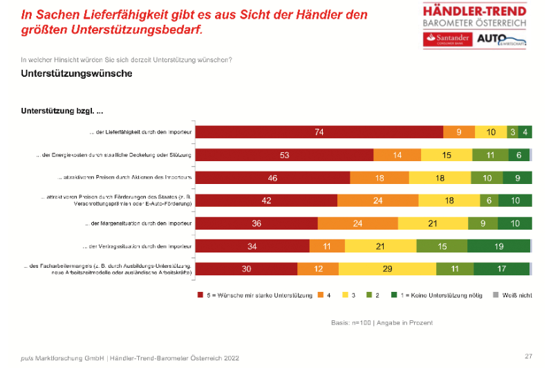 74 Prozent der Befragten wünschen sich bei der Lieferfähigkeit „starke Unterstützung“ seitens der Importeure. Auf Platz 2 liegt bei 53 Prozent starker Unterstützungsbedarf bei den Energiekosten, wo eine staatliche Deckelung oder Stützung benötigt wird. Bei „attraktiven Preisen durch Aktionen des Importeurs“ geben 46 Prozent Bedarf an „starker Unterstützung“ an. Knapp dahinter (42 Prozent wünschen sich starke Unterstützung) ist die Notwendigkeit nach attraktiveren Preisen durch Förderungen des Staates. Starke Unterstützung durch den Importeur im Bereich der Margensituation wünschen sich 36 -Prozent. Die Vertragssituation erfordert bei 34 Prozent der Betriebe starke Unterstützung durch den Importeur, 19 Prozent sehen keinen Unterstützungsbedarf. 30 Prozent wünschen sich starke Unterstützung beim Facharbeitermangel, für 17 Prozent ist keine Unterstützung nötig.