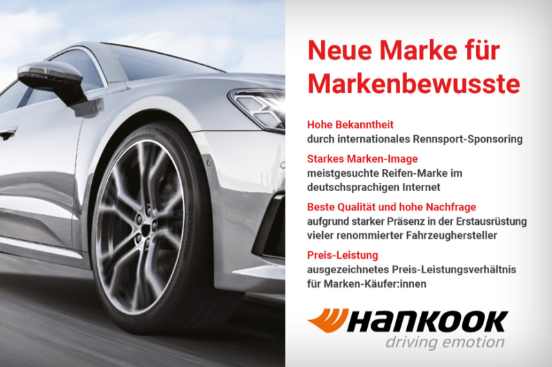 Als zweite Neuerung werden ab März HANKOOK Reifen erstmals auf meinereifen.at zu konkurrenzfähigen Preisen angeboten. Der Grund dafür liegt auf der Hand: HANKOOK ist die im Web meistgesuchte Reifenmarke im deutschen Raum. Diese Tatsache sowie die hohe Bekanntheit und Beliebtheit der Marke HANKOOK passen genau in das Wachstumskonzept von meinereifen.at. Denn wer nach Hankook sucht, wird in Zukunft schnell auf meinereifen.at stoßen, was wiederrum allen teilnehmenden Händlern potenzielle Kunden bringt.