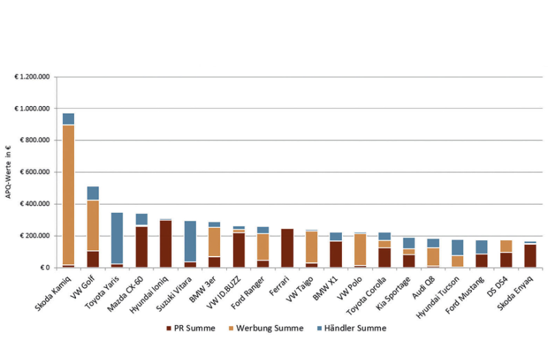 Auch die Modelle des VW-Konzerns wie der Skoda Kamiq, VW Golf, VW Taigo und VW Polo erreichen Topwerte beim Anzeigenpreisäquivalent in der Markenwerbung. Bei den Händleranzeigen erzielen Toyota Yaris und Suzuki Vitara Werbeäquivalenz-werte zwischen 200.000 und 300.000 Euro.