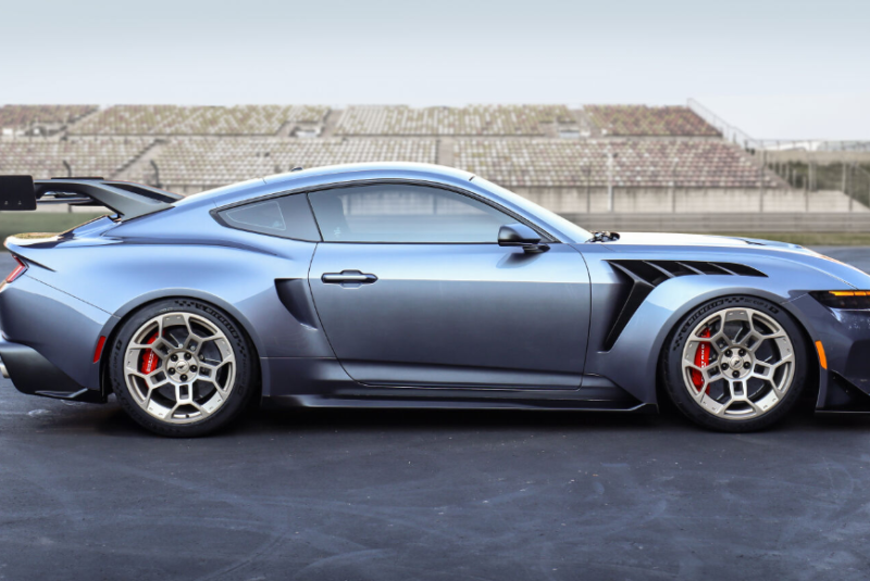 Die Karosserie des Mustang GTD setzt auf Leichtbau. Kotflügel, Seitenleisten, Dach, Motorhaube und Kofferraumabdeckung bestehen ebenso aus Karbon wie der Frontsplitter und der funktionale Heckdiffusor. Auf Wunsch werden auch die Bug- und Heckschürze aus dem leichten Verbundwerkstoff gefertigt. Das Gleiche gilt für das zur Verfügung stehende Aerodynamik-Paket mit seinem vollverkleideten Unterboden und den speziellen Luftleitelementen im Frontbereich. Sie lassen sich, ebenso wie der Heckflügel, hydraulisch verstellen.
