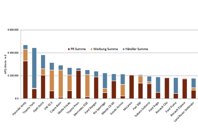 Bei den Händleranzeigen landete der Toyota Yaris diesmal eindeutig an der Spitze, gefolgt vom Ford Puma und dem Ford Kuga. Bei den PR-Inseraten erreichte der Hyundai Ioniq einen Werbewert von 329.655 Euro und hängte damit den Toyota Prius (244.762 Euro) relativ klar ab.