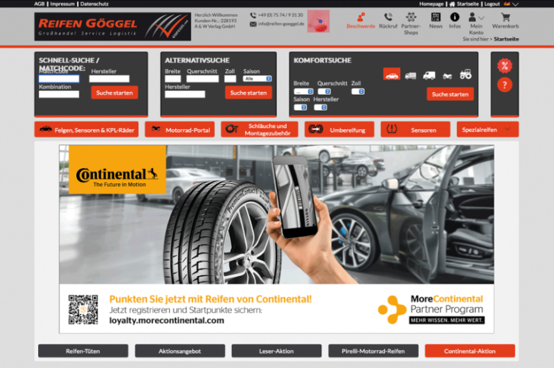 Über 10 Millionen Reifen und 900.000 Felgen sind auf dem Online-Marktplatz von Reifen Göggel in der Regel ständig verfügbar, insgesamt können 150.000 Artikel abgerufen werden. Innovativ präsentiert sich auch das Shop-in-Shop-System, das heißt, den Shop können Kunden von Reifen Göggel auch für ihre Kunden nutzen.