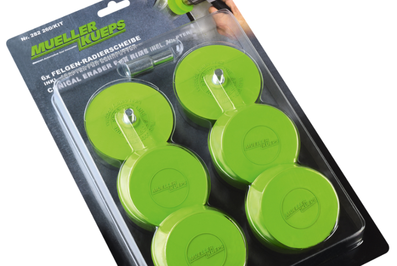 Die Felgen-Radierscheibe von Müller-Werkzeug besteht aus einem weichen, umweltfreundlichen Gummi. Die besondere Elastizität schütze Oberflächen und Lackierungen. Gleichzeitig sei bei der Entwicklung auf die Stabilität des Materials und die damit verbundene Langlebigkeit geachtet worden. Bei der Verwendung nutze sich die Scheibe, vergleichbar mit einem Radiergummi, langsam ab. Eine Markierung auf der Oberseite der Scheibe gebe an, wie weit sich das Gummi abtragen lasse, bevor der Radierer aus Schutzgründen zu wechseln sei. Mit jedem Radierer ließen sich je nach Kleber und Felge über 100 Auswuchtgewichte entfernen. Die Felgen-Radierscheibe ist einzeln oder im Sechser-Pack samt Adapter für Bohrfutter (Artikelnummer 282 260/Kit) erhältlich.